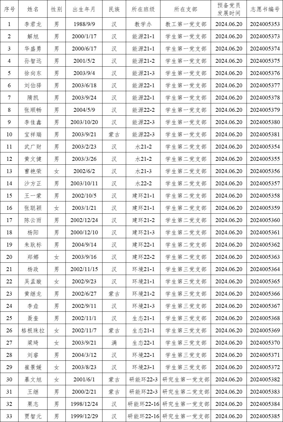 经过一年的教育和考察,李君龙、解旭、华盛勇、孙智远、徐向东、刘伯驿、隋凯、张顺畅、李佳鑫、宝祥瑞、武广财、黄文健、曹艳荣、沙方正、王一蒙、张聪颖、陈云雨、杨阳、朱耿标、郑娜、杨政、吴孟璇、黄继龙、李垚、聂奎、格根珠拉、梁琦、刘睿、崔景媛、暴文旭、王继、栗志和贾智元共三十三位同志预备期将满,学院各党支部拟在近期召开党员大会讨论他们的转正问题。为进一步增强发展党员工作的透明度,严格发展党员工作程序,根据《中国共产党章程》和《中国共产党发展党员工作细则》,现将近期拟转正的预备党员情况予以公示。