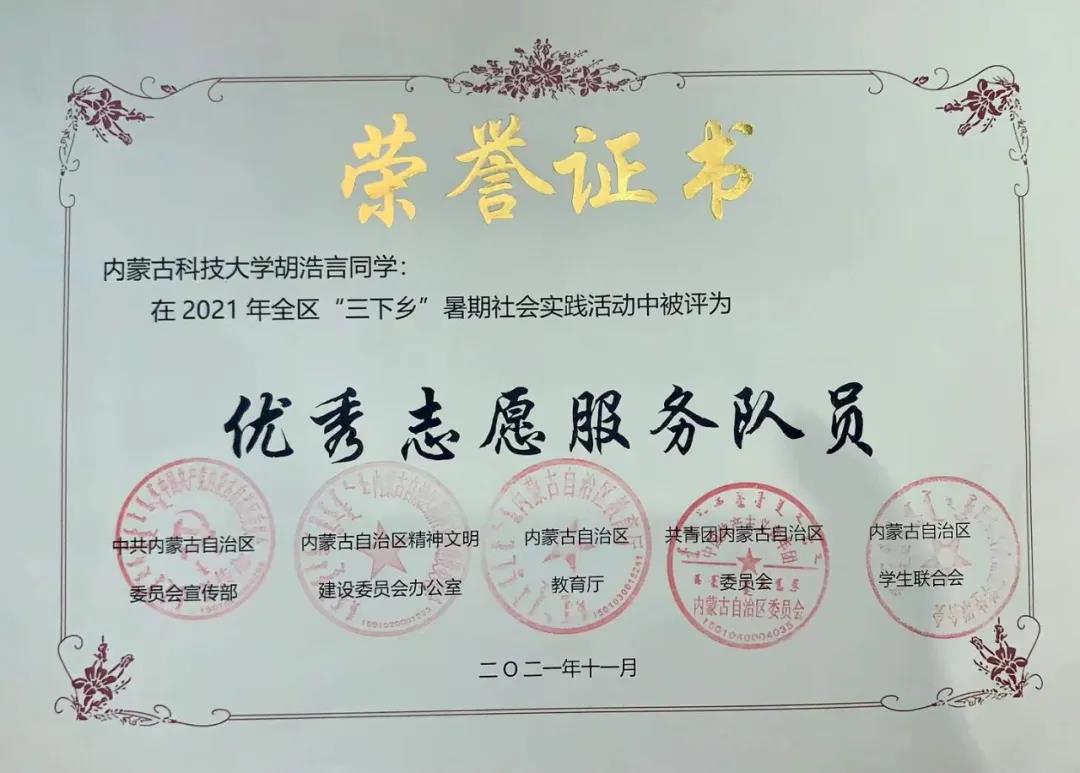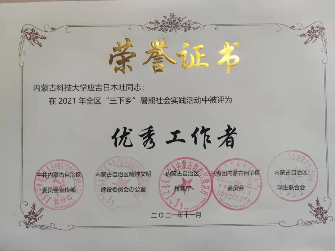 近日,中共内蒙古自治区委员会宣传部、内蒙古自治区精神文明建设委员会办公室、内蒙古自治区教育厅、 共青团内蒙古自治区委员会、内蒙古自治区学生联合会联合印发《关于表彰 2021年全区大中专学生志愿者暑期文化科技卫生“三下乡”社会实践活动先进集体和优秀个人的决定》,表彰在2021年暑期“三下乡”社会实践活动中表现优秀、成绩突出的集体和个人。我院2021年暑期“三下乡”社会实践直属队获评“优秀志愿者服务队”荣誉称号,指导教师应吉日木吐获评“优秀工作者”荣誉称号,给排水19-2班志愿者胡浩言获评“优秀志愿者服务队员” 荣誉称号。