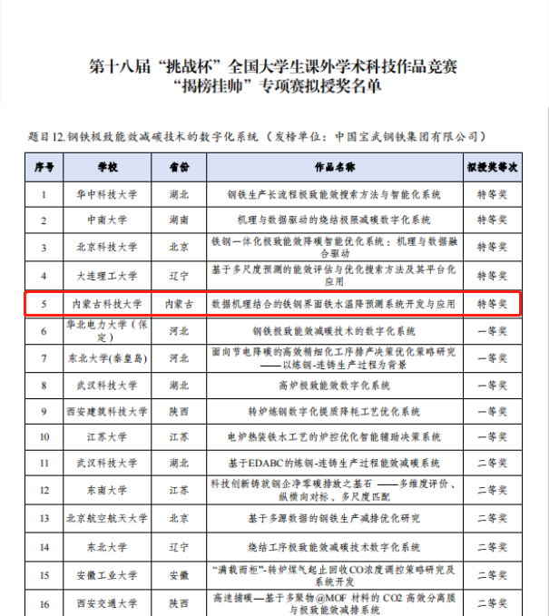 近日,第十八届“挑战杯”全国老员工课外学术科技作品竞赛“揭榜挂帅”专项赛终审决赛在贵州大学举办。由黄军教授、张亚竹副教授、刘新副教授共同指导,邓旭阳、安超达等同学完成的作品“数据机理结合的铁钢界面铁水温降预测系统开发与应用”荣获特等奖。