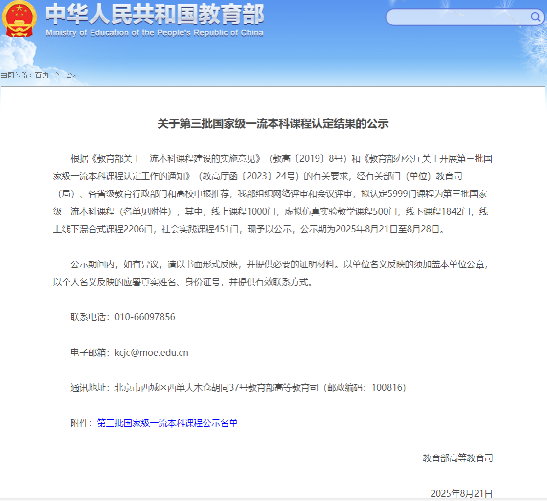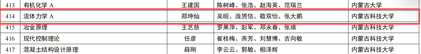 8月21日,教育部公布了《关于第三批国家级一流本科课程认定结果的公示》,我院郑坤灿教授负责的《流体力学A》课程被认定为“国家级线下一流本科课程”,这是学院“十四五”期间在国家级本科课程建设方面取得的重大突破,为学院教学改革和发展注入强劲动力。