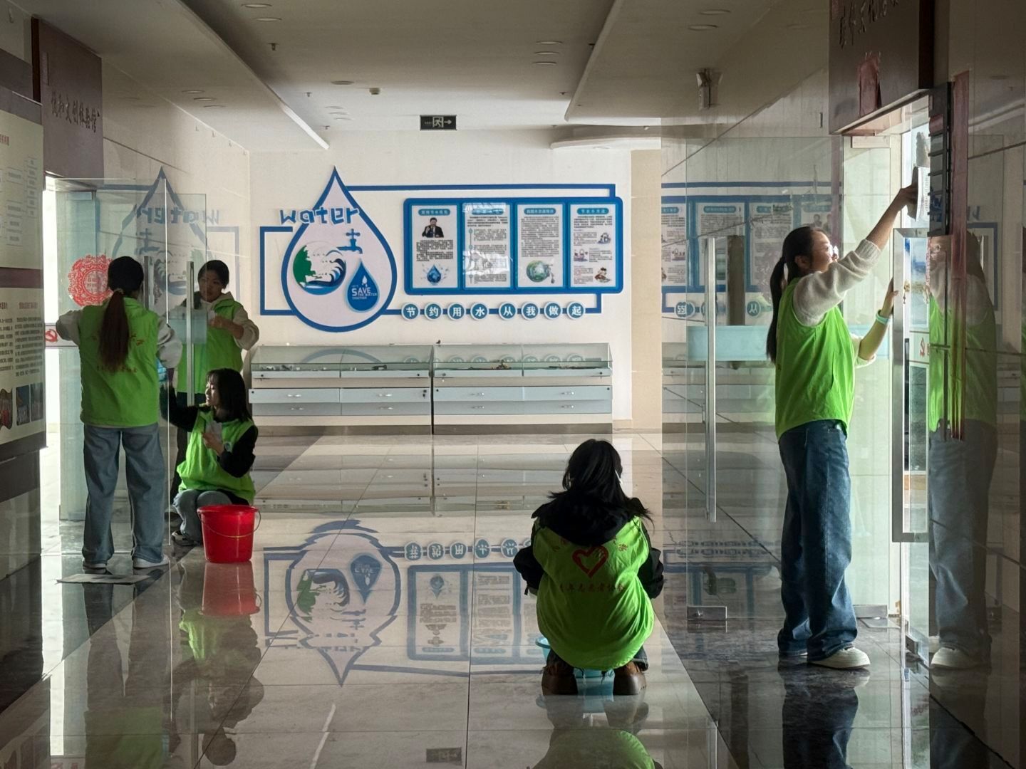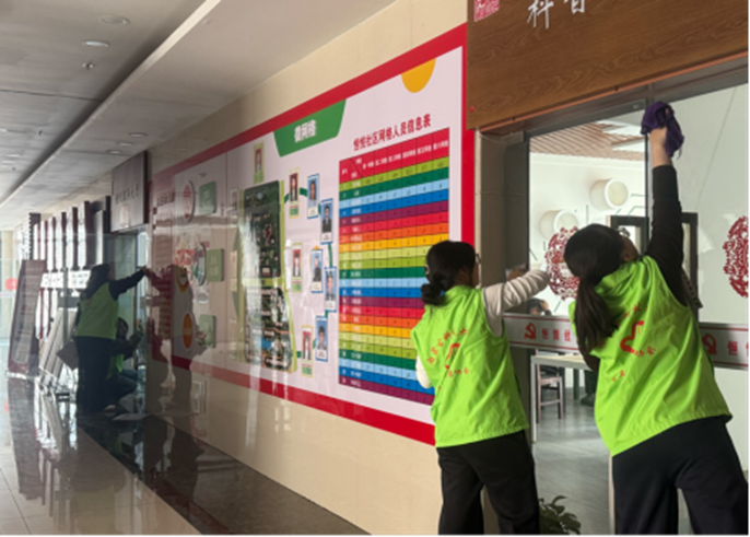 在卫生清扫时,大家分工明确、默契配合,从地面到墙面,从门窗到展板,每一处细节都认真清理,营造出整洁舒适的公共空间。同时,志愿者们还协助规范社区非机动车停放秩序,规范摆放违停车辆,提升社区通行效率与整体风貌。