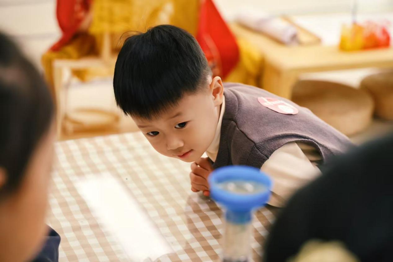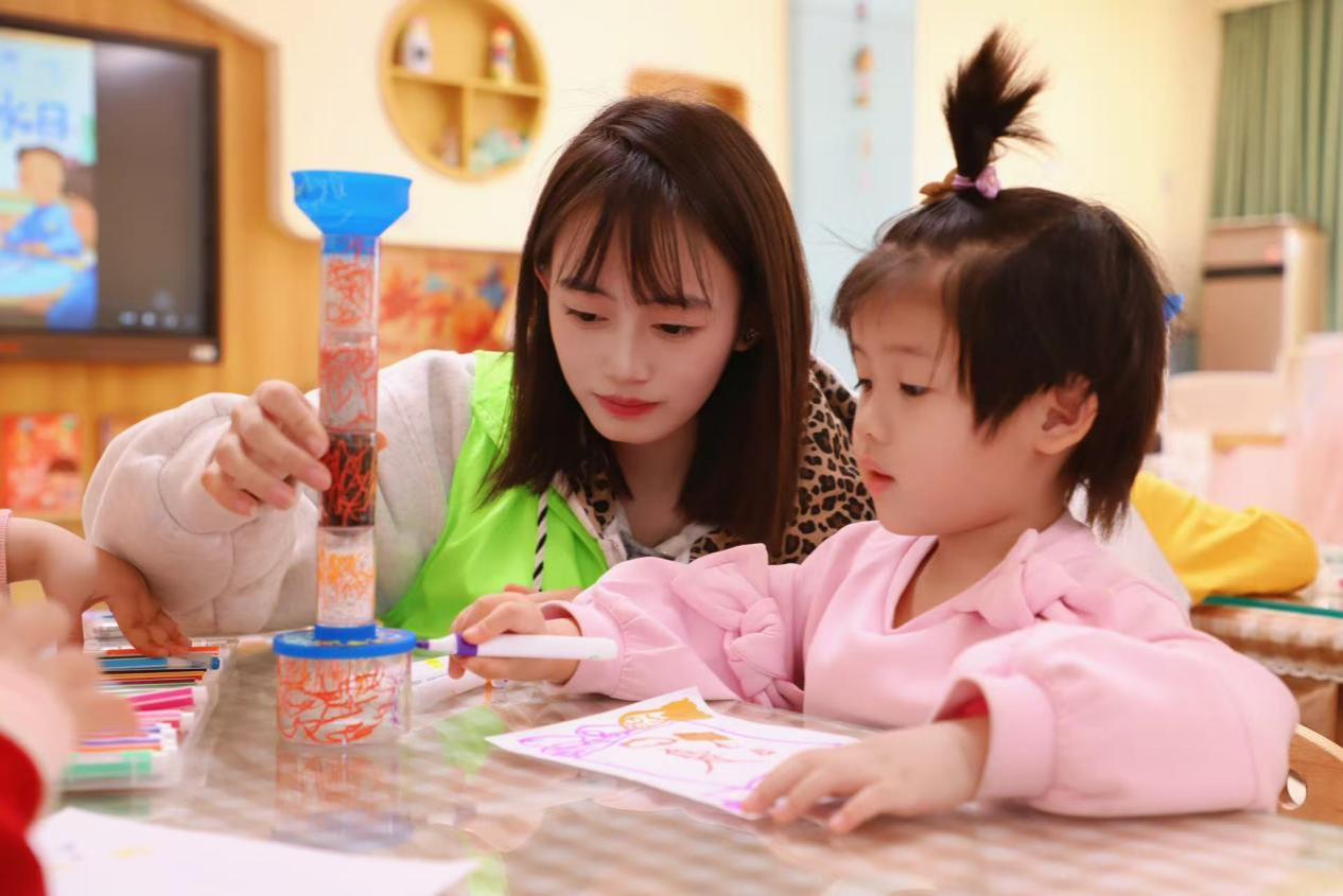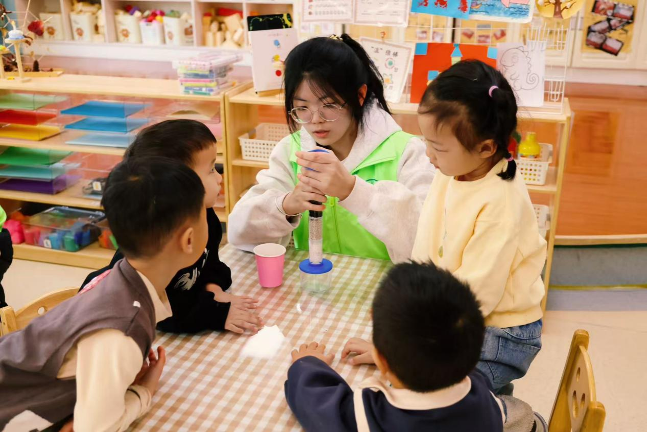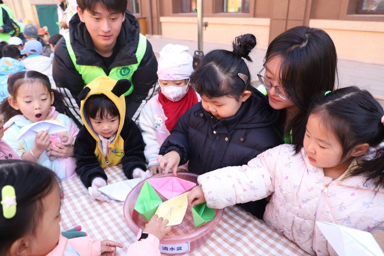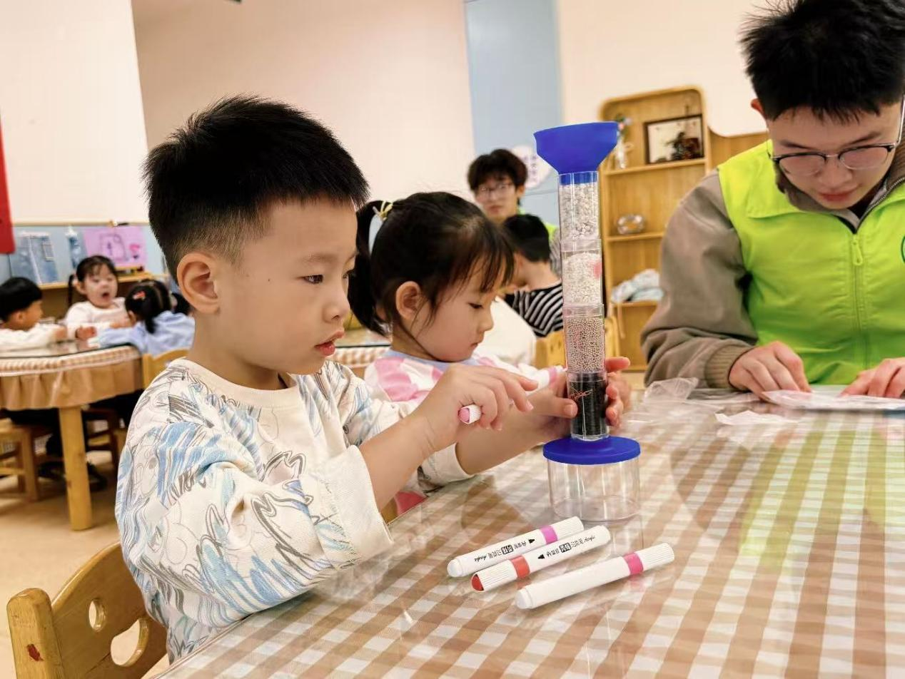结合我院专业特色,活动还特别设置了“神奇水世界”科普环节。志愿者们通过“水的浮力”小实验,带领孩子们观察纸船漂浮的现象,激发了他们对科学现象的浓厚兴趣。随后,在“净水装置科学手工”环节中,志愿者们手把手指导幼儿,动手组装净水装置,学习简易的净水原理,还拿起彩笔为装置画上创意图案,打造属于自己的“专属净水器”。从动手组装到创意绘画,不仅锻炼了孩子们的动手能力,更在实践中直观了解到水资源净化的小知识,深化了护水环保的理念,专业的科普也得到了幼儿园老师们的一致认可。