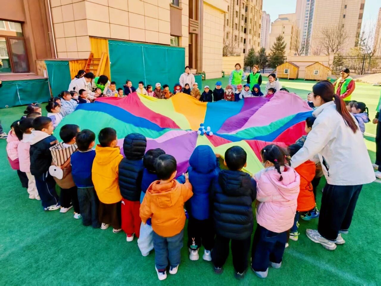 趣味游戏环节成为孩子们感知节水的欢乐课堂,我院志愿者化身“节水使者”,带领孩子们开展了一系列沉浸式游戏。在“保护小水滴”游戏中,孩子们合力抖动彩虹伞,小心翼翼地守护着伞面上的海洋球,仿佛在守护珍贵的生命之源;“快乐传水”与“过障碍运水”则是一场耐力与细心的考验,孩子们手持水杯穿梭在锥形桶之间,屏息凝神,生怕洒漏一滴水。这些游戏不仅锻炼了孩子们的肢体协调能力,更让他们在奔跑与传递中,切身体会到了“每一滴水都来之不易”的真谛。