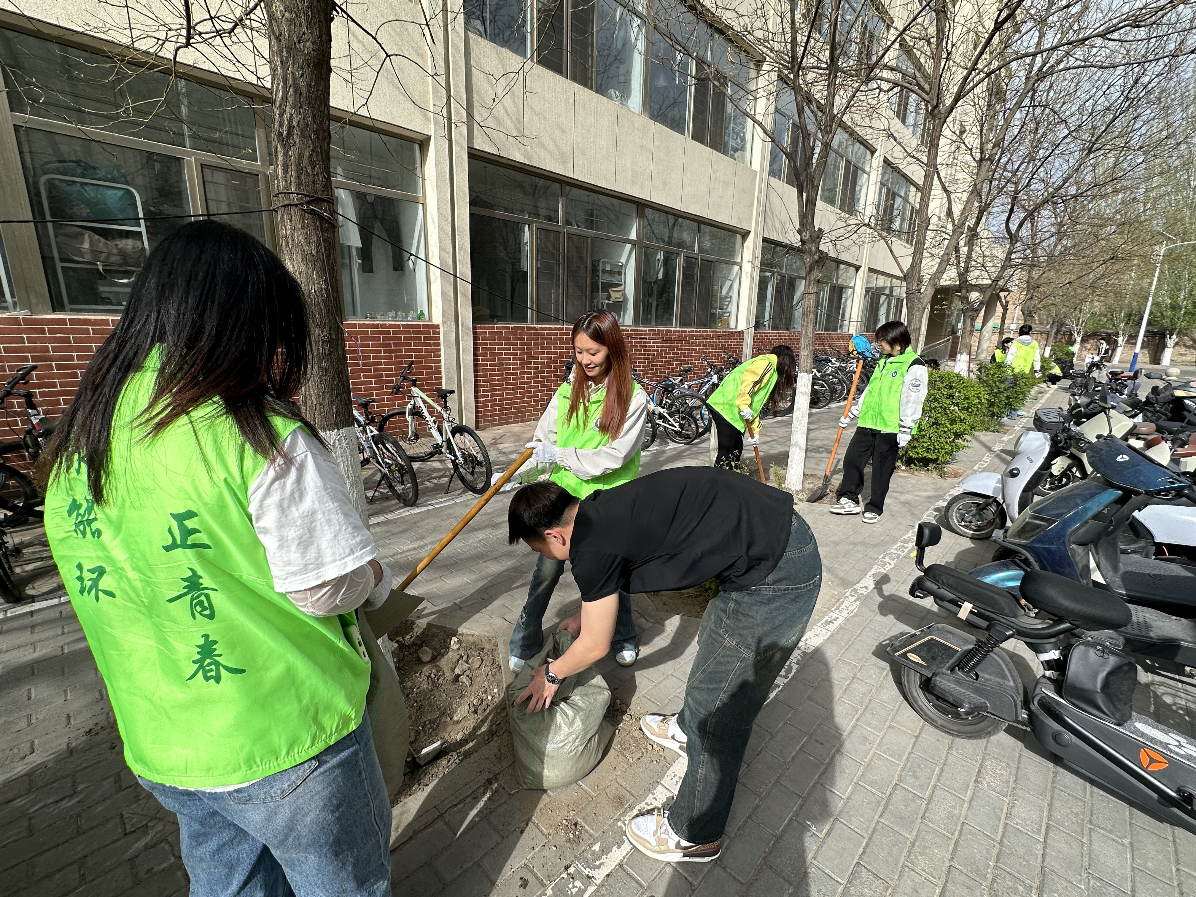 活动伊始,志愿者们统一身着志愿者马甲,认真听取后勤处杜老师介绍作业安全注意事项等相关事宜,明确分工、细化责任,确保绿化整改工作安全有序推进。随后,志愿者们满怀热忱奔赴校园各责任区域,有序开展树木松土养护作业。大家分工协作、默契配合,手持工具为树木周边土壤疏松透气、清理杂草杂物,以认真细致的态度投入养护工作,足迹遍布校园绿地各处,用实际行动改善绿植生长环境,为校园添绿护绿。