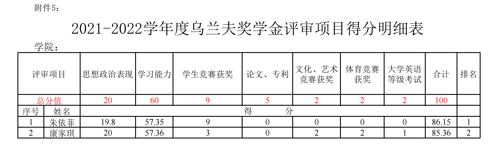 2022学年度乌兰夫奖学金评审项目得分明细表公示