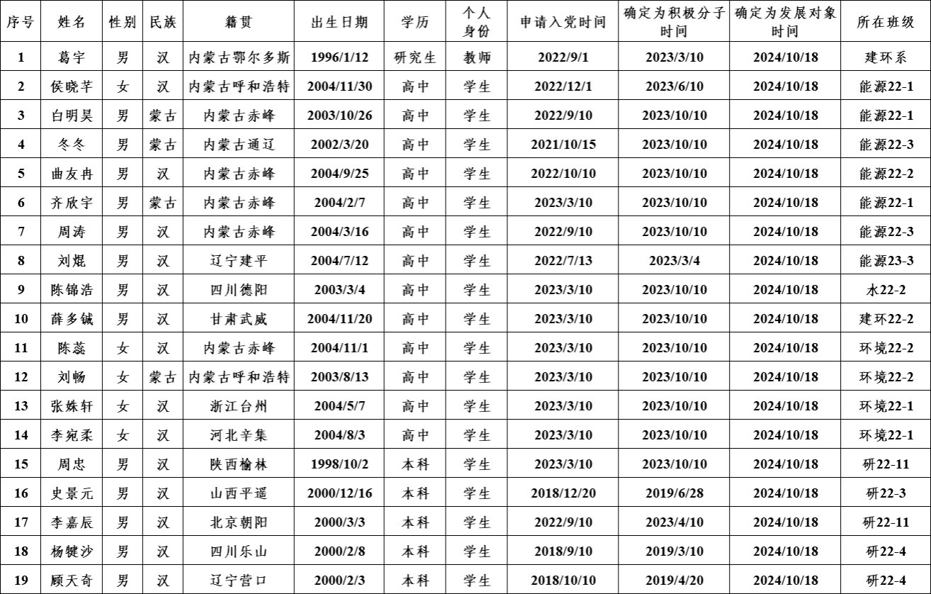 beats365党委于2024年10月18日召开党委会讨论决定,确定葛宇等19位同志为党员发展对象。为进一步增强发展党员工作的透明度,确保发展新党员的质量,根据《中国共产党章程》和《中国共产党发展党员工作细则》,现将葛宇等19位同志的基本情况予以公示: