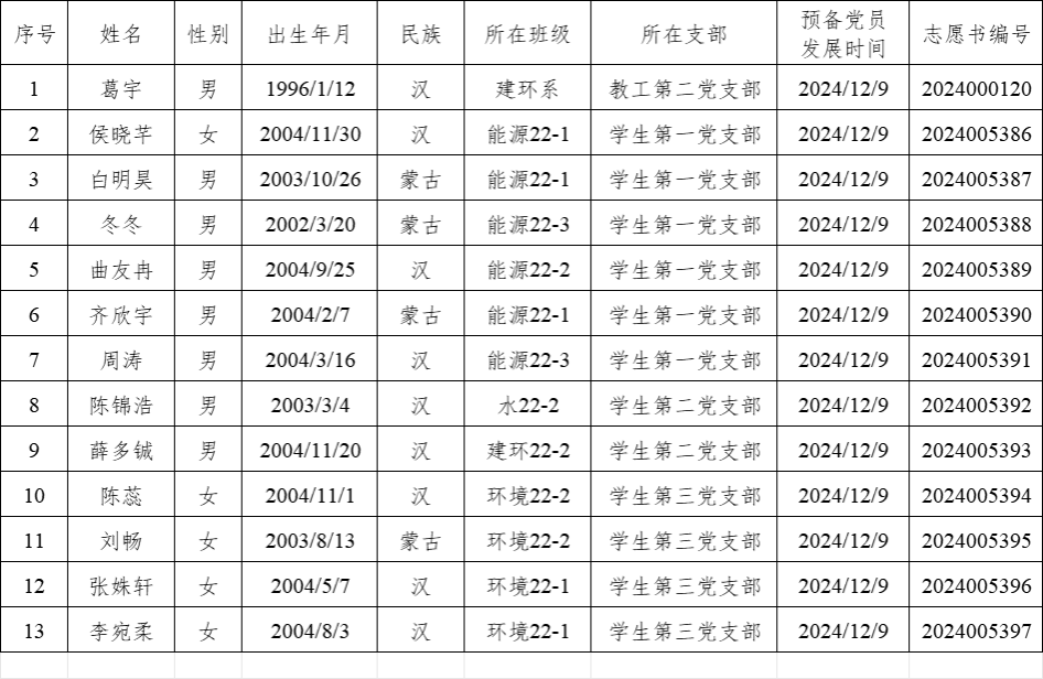 经过一年的教育和考察,葛宇侯晓芊白明昊冬冬曲友冉齐欣宇周涛陈锦浩薛多铖陈蕊刘畅张姝轩李宛柔共十三位同志预备期满,学院各党支部拟在近期召开党员大会讨论他们的转正问题。为进一步增强发展党员工作的透明度,严格发展党员工作程序,根据《中国共产党章程》和《中国共产党发展党员工作细则》,现将近期拟转正的预备党员情况予以公示。