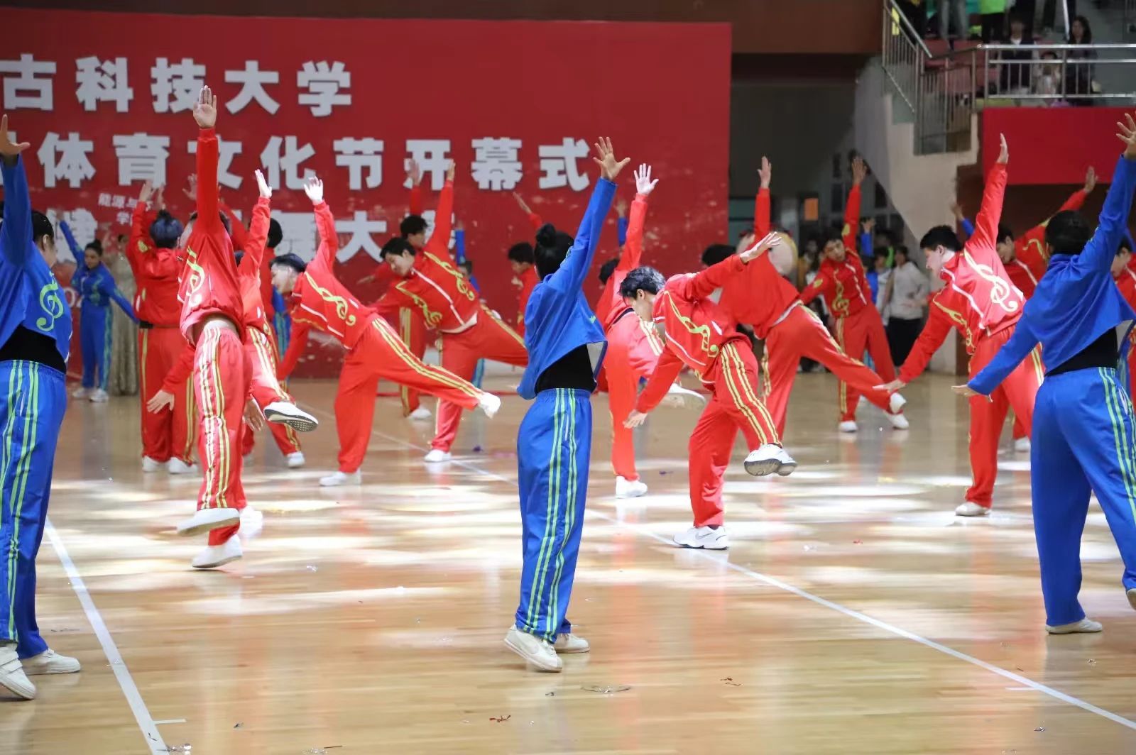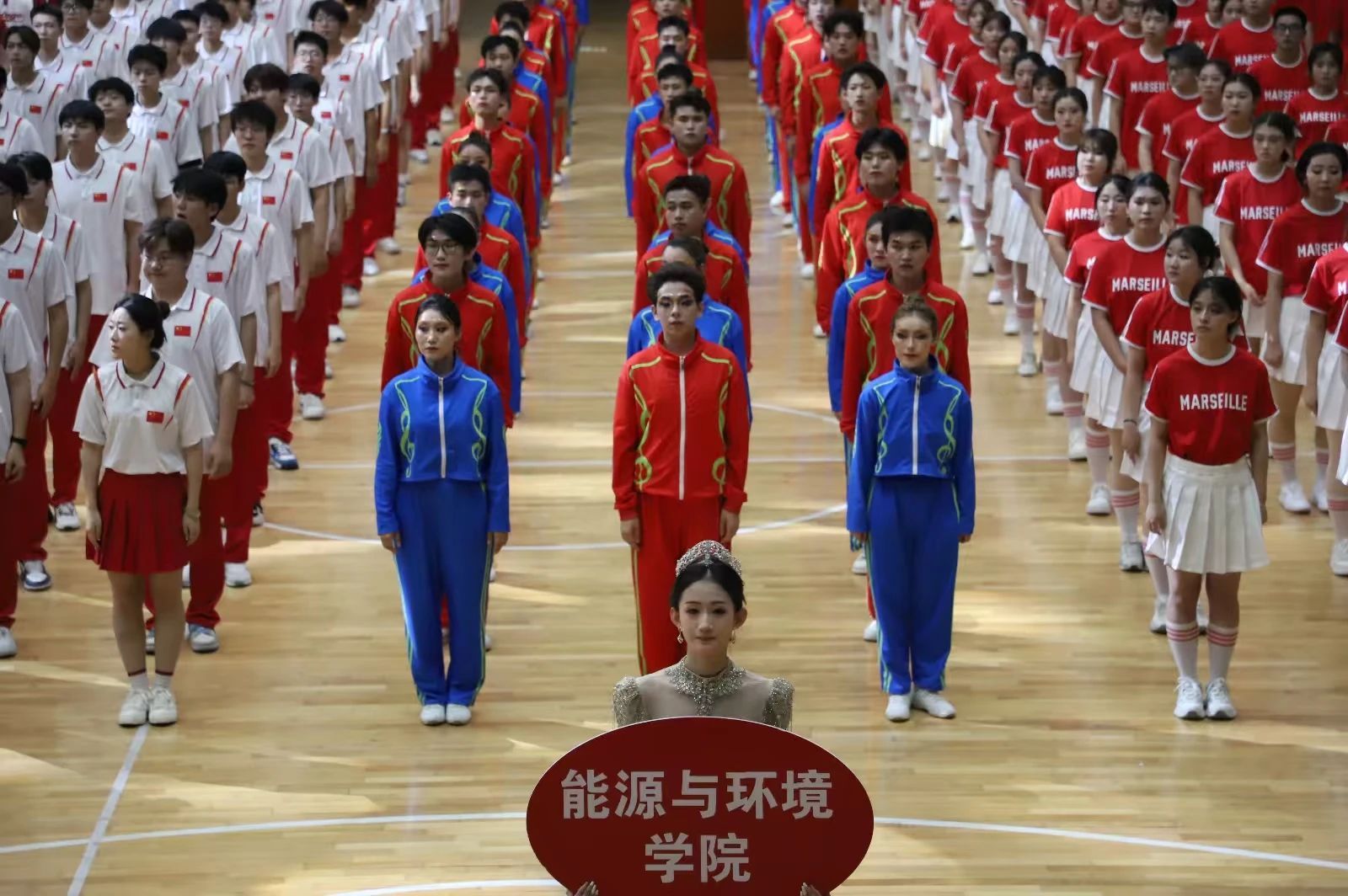 一支身着红蓝两色亮眼队服的队伍